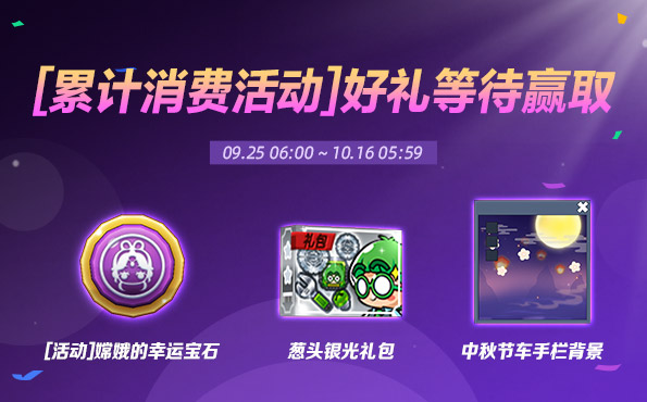 同时,“嫦娥的幸运宝石礼包”也在9月25日06:00~10月23日05:59在商店内限时开启兑换!而在9月25日06:00~10月16日05:59期间内累计消费至对应电池数,可获得不同数量的“[活动]嫦娥的幸运宝石”、“葱头银光礼包(1个)”、“中秋节车手栏背景(无限制)”!在9月25日06:00~10月15日23:59在商店内有过任意消费,还可参与“跑跑卡丁车x金士顿纪念闪存礼盒(1个)”的抽奖!