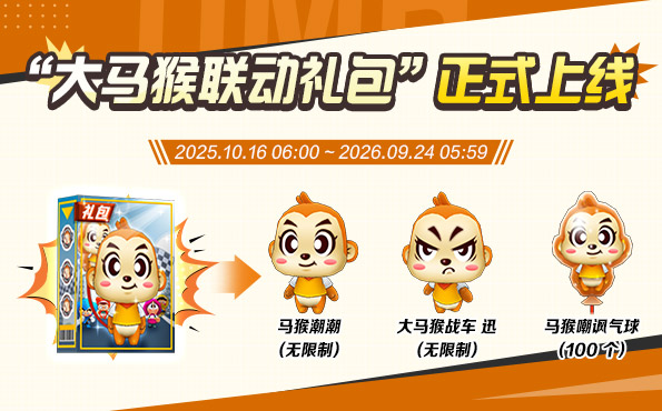 同时,游戏内<嫦娥的幸运宝石1+1>同步开启!商店内 “大马猴联动礼包”也正式上架,兑换可得“马猴潮潮(无限制)”、“大马猴战车 迅(无限制)”、“马猴嘲讽气球(100个)”,切勿错过~