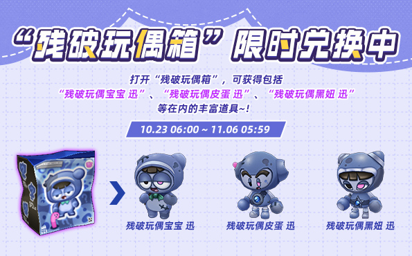本次更新后,各位可在10月23日06:00 ~ 11月6日05:59于商店内直接兑换“残破玩偶箱”,或是通过升级跑跑通行证来获得“残破玩偶箱”~