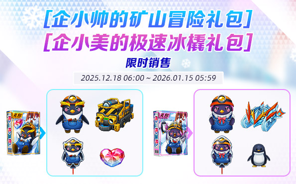 同时,商店内还在12月18日 06:00 ~ 1月15日 05:59内开启“企小美的极速冰橇礼包”、“企小帅的矿山冒险礼包”限时兑换!