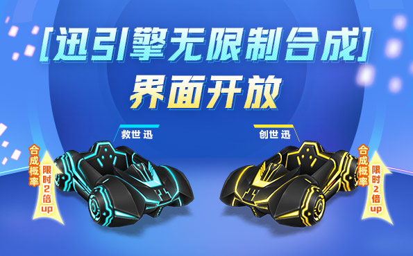《跑跑卡丁车》[迅引擎无限制合成]今日开放,在3月19日06:00 ~ 4月2日05:59期间,专属车辆“救世 迅”、“创世 迅”还将以2倍的合成概率登场,同时商店内改装、合成道具限时7折兑换,切勿错过!