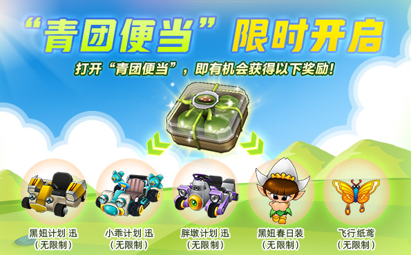 春和景明,清明安康,《跑跑卡丁车》中“青团便当”也同步上线!打开“青团便当”,即有机会获得“黑妞计划 迅(无限制)”、“小乖计划 迅(无限制)”、“黑妞春日装(无限制)”、“飞行纸鸢(无限制)”等道具,切勿错过!