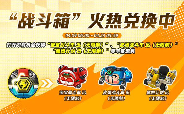 春色满园,生机盎然,《跑跑卡丁车》“战斗箱”同步登场!打开“战斗箱”即有机会获得“宝宝战斗车 迅(无限制)”(*该车无法装备尾灯)、“皮蛋战斗车 迅(无限制)”、“黑妞计划 迅(无限制)”、“宝宝战斗气球(30个)”等丰富道具~!